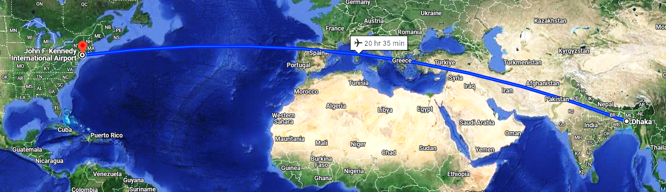 The distance between JFK International Airport in New York City and Hazrat Shahjalal International Airport in Dhaka is approximately 7,866 miles or 12,660 kilometres. The journey will take somewhere between 20 hours to 22 hours. While it’s not a quick hop, it’s definitely a journey that’ll take you from the heart of one vibrant city to another.